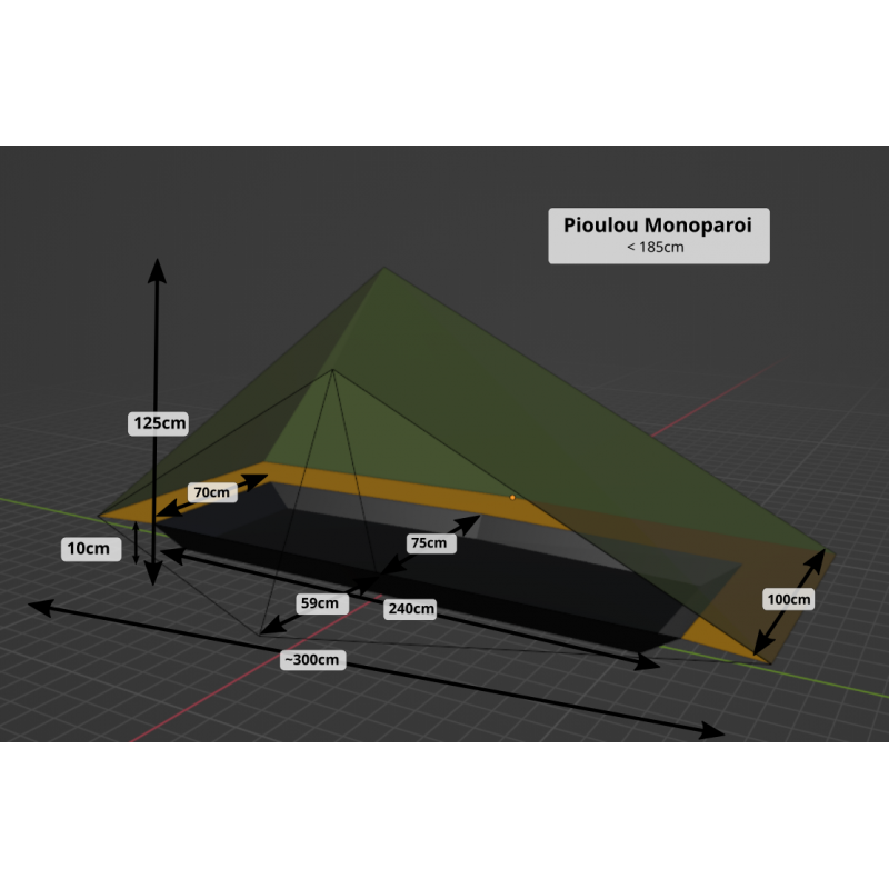 Le Pioulou monoparoi est dérivé du Pioulou double paroi. Il sera idéal pour les personnes cherchant une tente encore plus légère. Suffisamment grand pour une personne jusqu'à 1m85, le Pioulou permet de dormir, se tenir assis et de se changer sans avoir à sortir de l'abri. Sa forme pyramidale offre une excellente protection aux intempéries ainsi qu'une abside pour abriter le matériel.